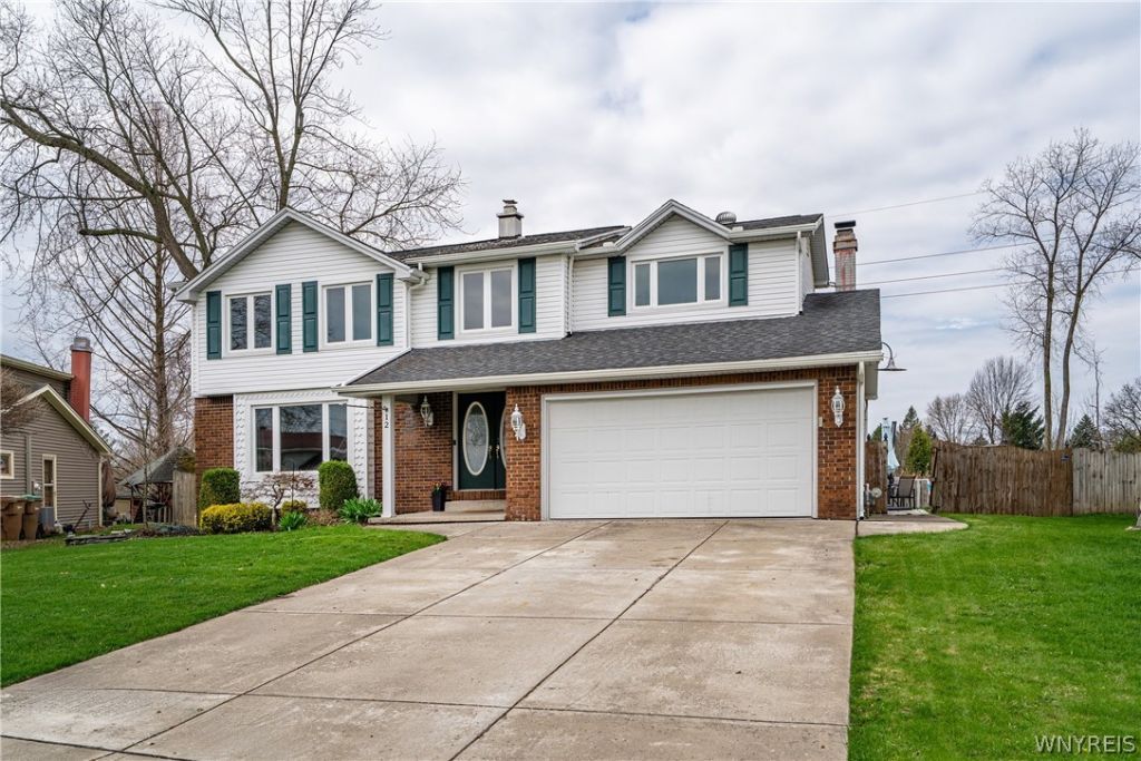 Welcome to 12 Old Farm Court, a beautiful 4 bed, 2 bath home located on a quiet cul-de-sac. This peaceful home is located just minutes away from Cayuga creek and the Reinstein Woods Nature Preserve, but with easy access to Transit Rd and all of its amenities. This home has been lovingly cared for and meticulously updated- there is nothing left to do but move in! Enter the double entry doors with gorgeous decorative glass and into the living room, with warm dark hardwood floors and a large picture window looking out to the street. The hardwood floors continue into the formal dining room and the kitchen, complete with stainless steel appliances, granite countertops, pantry, and rich chestnut color wood cabinetry. First floor full bath conveniently located off the family room. The family room includes a wood burning fireplace, perfect for cozy winter evenings, with sliding glass doors that lead to the stamped concrete back patio. The backyard is your own private oasis, perfect for relaxing or entertaining, with a fully fenced-in yard, built-in bar, gas fireplace, and hook-ups available for a hot tub. Upstairs, are all four bedrooms with double closets, and the updated full bathroom, with a stylish tiled bath and stone vanity countertop. Additional updates include: new Pella windows (2021), replaced drain tiles in basement (2024), replaced garage roof (2024), roof de-icing cables installed on front of house (2024), new sump pump with backup installed (2024), new hot water tank (2025), new dryer (2025). Open House on 4/18 from 11-1.