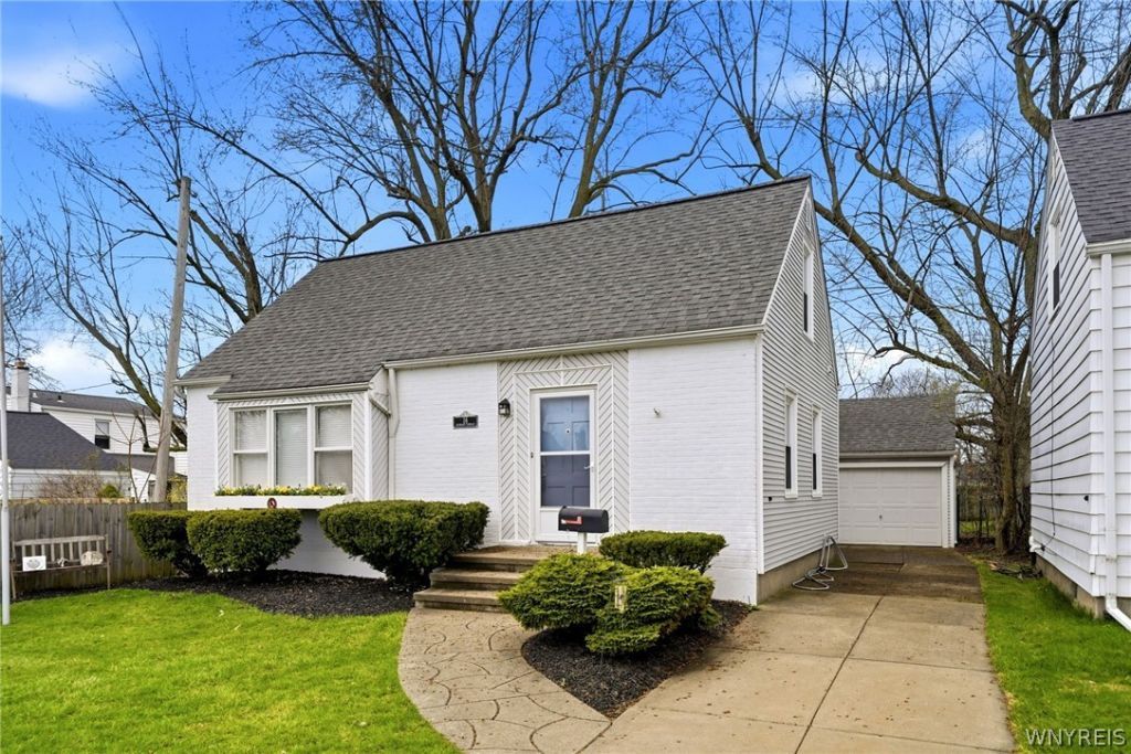 Beautifully maintained Cape Cod in the Town of Tonawanda with intentional updates throughout. This 3 bedroom, 1.5 bath home is ideally located near local amenities & within walking distance to St. Joe's High School. Freshly groomed landscaping creates a strong first impression & adds to the home's inviting curb appeal. Inside, you'll find a comfortable layout featuring freshly glossed hardwood floors, a professionally painted interior throughout (26), & the convenience of a 1st-floor bedroom. The living room showcases a bright front-facing window bump-out with a cozy sitting ledge, while the formal dining room offers charming built-ins for added character & functionality. The kitchen offers ample cabinetry, a pantry & all appliances are included. The enclosed sunroom provides great space to enjoy morning coffee or entertain guests (not incl. in sqft). The partial finished basement adds additional living space & a built-in bar that is perfect for game nights or casual gatherings. Notable updates included: New blinds throughout (26), Hot water tank (24), regularly serviced Furnace, & Central-AC for added peace of mind. Outside, enjoy a spacious, fully fenced dry yard, w/professional yard drainage system installed, along with a 1-car detached garage offering great storage. Don't wait on this delightful turn-key home! All offers, if any, to be submitted by Wed. April 22nd @ Noon.
