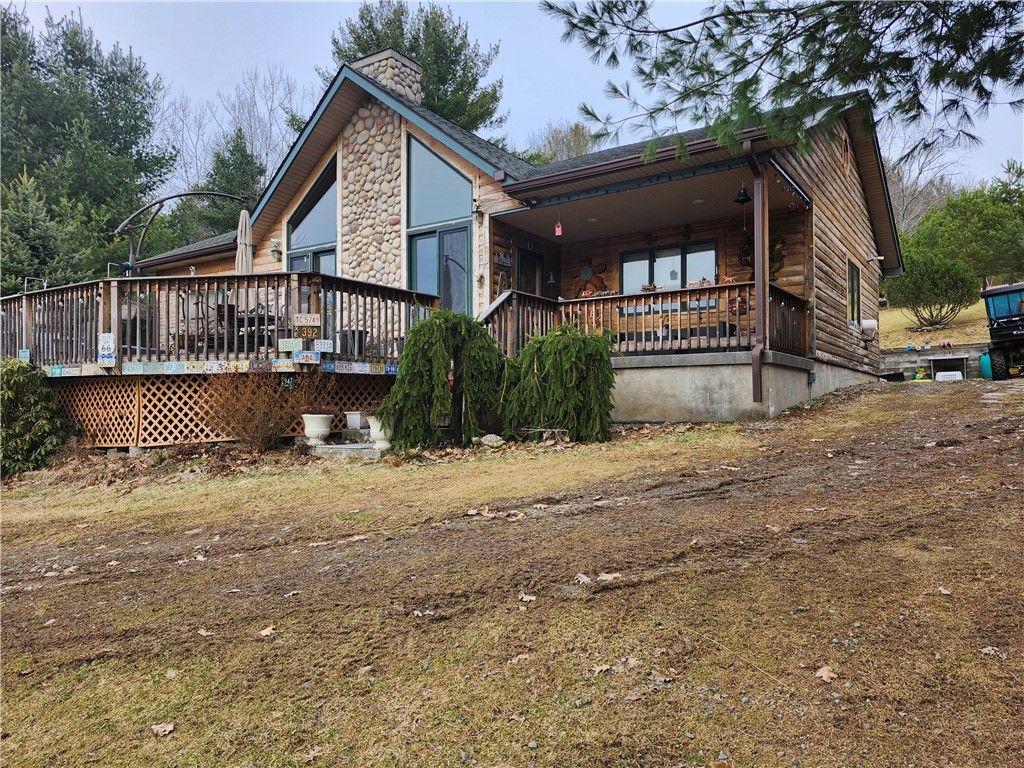 Escape to 27 acres filled with wildlife, delightful mountain views and of unspoiled woodlands for hunting. Venture towards natural rolling creek and 1 acre fishpond. This custom-built Cape Cod Style home is nestled away surrounded by nature. Its architectural design features a Cathedral ceiling, a double set of doors facing westward to an open deck, oversized wall windows (above) to offer you Mother Nature's canvas and skyline sunset views. The spacious open floor plan provides all the creature comforts of an elegant home ideal for entertaining. It has a large living room, dining room, kitchen with granite counters, wood moldings throughout. Retire to the 2 main floor bedrooms. See the large primary bedroom and private bathroom with floor to ceiling custom tiles, soaker tub and walk-in shower. A 2nd bedroom is located off the kitchen on the opposite side. It includes a full bathroom with walk-in shower. The laundry/utility room is conveniently located nearby. The romantic spiral staircase off the living room leads to a cozy, serene loft area that faces the westward windows too. This loft gives access to more multi-purpose attic space for sleeping quarters or a home office. The other half of the attic is primed for additional storage space and/or is ready for paint and flooring. The great outdoors offer a 2nd lot with a private roadway entrance from Route 8 that leads to a rustic cabin with full kitchen and electricity, and an outhouse. It's a perfect retreat house or secluded for hunting (no running water or septic). The detached garage has a storage loft, concrete floor, and electricity.