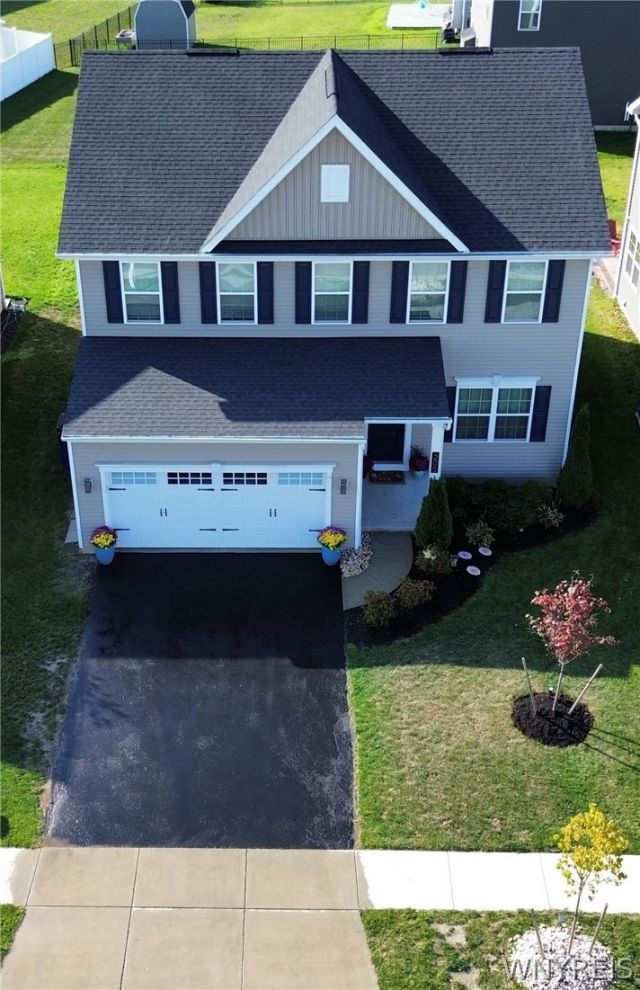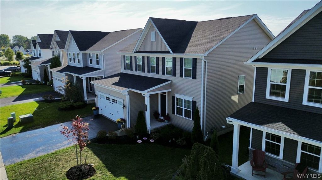Step into this stunning four-bedroom home, thoughtfully designed with an open-concept layout that blends style and functionality. The welcoming entry features a private office with crown molding, offering a refined and flexible workspace. The bright kitchen showcases white cabinetry, quartz countertops, stainless steel appliances, a large center island, and a dining area with sliding glass doors leading to the backyard. The living room features warm neutral tones and is centered around a cozy gas fireplace, creating an inviting main living space. The second floor includes a spacious primary suite with a full bathroom and walk-in closet, along with three additional bedrooms, a second full bath, and convenient second-floor laundry. The backyard has been professionally enhanced with over $80,000 in upgrades, creating a private outdoor retreat. A custom in-ground pool installed in 2024 features LED lighting and a high-end heating system for extended seasonal use. An extended full-width stamped concrete patio spans the rear of the home, providing ample space for entertaining, with integrated lighting that adds a warm ambiance in the evening. Ideally located near scenic walking trails and the Amherst bike path, this home offers a peaceful setting with convenient access to outdoor recreation. Located within the top-rated Williamsville School District, this property combines modern living, thoughtful upgrades, and an exceptional location. Don't miss this opportunity!