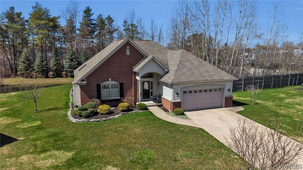 Welcome to this extraordinary Getzville ranch where you can experience luxury living in the beautiful Collingwood Estates! This contemporary three bed, two bath home features an open floor plan poised to live & entertain in style maintenance-free. Gorgeous ceramic tile leads you from the front foyer to the grand living room with vaulted ceilings, gas fireplace, built-in bookcases and plush carpeting. Natural Oak floors lead you to open concept kitchen with espresso cabinets, granite countertops along with a oversized island to entertain guests while preparing a meal. Dining room offers a serene view with french doors to the four season room. Making your way past the first floor laundry room, a massive primary suite with walk-in closet & full bath complete with dual sink vanity and tiled shower. Two additional bedrooms with plenty of closet space aside second full bath with tub perfect for family or guests. Heading downstairs, you'll be immediately greeted by a sitting room. Behind it, a massive fully finished space for crafting, play room or additional entertainment options with epoxy flooring throughout. Third room in basement offers ample storage with built-in shelving. High efficiency mechanics and energy efficient windows and doors keep utility costs low. Two car attached garage with lawn sprinkler system controls nearby. Freshly painted in neutral color scheme throughout, recessed LED lighting and virtually nothing do to but drop your bags and move in. Enjoy the great outdoors in the scenic yard on a private park-like lot with no rear neighbors and a gorgeous pond. Remote controlled patio awning provides summer shade to cool off. See 40 Collins Court and prepare to experience what luxury living is all about with zero maintenance & low HOA fees along with all of the shopping, dining and major highway access nearby! Located in the top ranking Williamsville (North) School District. Open House welcomes visitors for the first time on Saturday, April 18th from 11am-1pm; all offers due on Thursday, April 23 at 11am.